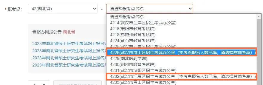 2023考研预报名期间(截图时间9月27日下午3点),湖北省出现了部分报考点满员的情况。 除了湖北省之外,下面也为大家汇总了预报名期间各个省市已经满额的报考点。 就了解到的情况而看,天津、山西、湖北、海南、重庆、四川、贵州等地的部分报考点已满额。 如果遇到报考点报满的情况,大家不要慌,也有一些挽救措施。 正式报名期间,如果遇到报考点已满的情况。大家可以试一试下面这些方法: 1.选择其他符合条件的临近报考点 如果要选的报考点有人数限制,报满了,这个时候尽量不要犹豫,快速下拉报考点,浏览一下有空缺的地点,更换报考点。要是本市都没有了,换一个离得近的城市选择报考; 2.查看报考点所在的省网报公告 一定要仔细查看报考点所在的省网报公告,是否还可以选其他满足条件的报考点,或是否会有新增的报考点。 3.打电话咨询是否有可协调的考点 如果所有报考点都报满了,省招生考试部门也可能会协调增加报考点或者考点,注意省教育考试院或者省招办相关通知,或者打电话或其他方式咨询。 另外,可以随时刷新,因为系统报考点的数量是“动态的”,有人取消报名后,他选的考位就会释放,那么这时你就可以选择这个报考点,然后赶快提交。 除了以上热门报考点,其他大部分地区不需要抢考点,考位充足,大家可以错开高峰期~ ♦提醒: ▶️受到各种因素的影响,有的同学还没有确定自己的目标院校,同样也涉及到报考点的选择。 ▶️凡是还没报名的同学,现在已经是10月份了,如果目标院校和专业都已经确定不变了,尽早提交志愿。 ▶️正式报名一共21天时间,不要拖到最后,以防后期所选择报考点满员造成不便。 1. 定向与非定向是什么意思? 答:定向即是按定向合同就业;非定向按本人与用人单位双向选择的办法就业。 选定向就业的应当在被录取前与招生单位、用人单位签订定向合同。 2. 准备报考的专业是学校自主命题,应该选全国统考还是单独考试? 答:选全国统考,单独考试是指经教育部批准的部分招生单位,为符合特定报名条件的在职人员单独命题的考试。 3. 哪些考生在填报时需要校验码?校验码是否可继续使用? 答:强军计划、援藏计划、少数民族骨干计划等三类考生网上报名时,需要校验码,没有校验码将不能选择相应类别。 不同类别校验码不能混合使用。 如果没有产生报名号,校验码可以继续使用。需要注意的是,校验码只能使用一次,即一个校验码只能对应一个报名号(包括已取消的报名信息)。 4. 如何选择报考点? 答:应届本科毕业生原则上应选择就读学校所在地报考点; 往届生应选择工作或户口所在地报考点,工作所在地报考点一般要求工作证明、社保记录,要仔细查看报考点要求。 对于报考点选择如有疑问,可以电话咨询省级教育招生考试机构、招生单位、报考点进行确认。 5. 应届生可否选择户口所在地报考点? 答:要看户口所在地报考点是否接收,一般不接收,让在学校所在地报考点。 6. 生成报名号以后哪些信息可以改?哪些不能改? 答:招生单位、考试方式、报考点在生成报名号后则不可以修改。如确实需要修改,在报名期间内重新填报报名信息。 7. 怎样判断网上缴费是否成功? 答:(1)查阅报考点所在省市区发布的信息,获取咨询方式。 (2)通过用户名和密码登录到研招网报名系统中查询缴费标志是否已变更为已缴费。 (3)查看银行卡消费记录,已扣费即已成功缴费,特殊情况下,研招网状态可能没有变为已缴费状态,请不用担心。 8. 是否一定要打印报名信息表? 答:如果报考点或招生单位要求打印的话就必须打印,建议打印或保存一份出来,报名号一定要记录起来。 9. 重新报名、重复支付是否退费? 答:退费情况需要查看各省市区报考点公告说明,一般是规定符合一定的条件即会退费。