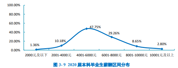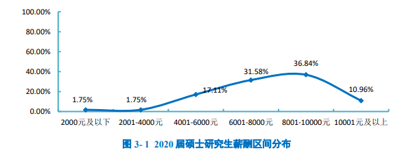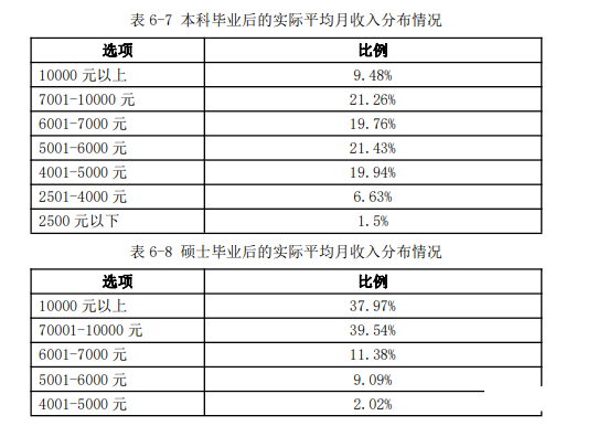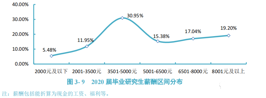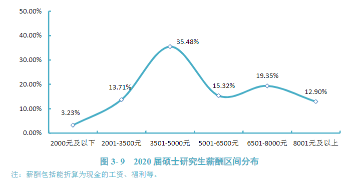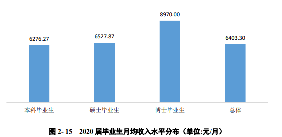 起步年薪: 北京工商大学2020届研究生转正后平均税前起步年薪为11.83万元,低于平均期望月薪0.98万元。具体来看,42.55%的毕业生年薪分布在5-10万元,占比最高;其次有36.17%的毕业生年薪分布在10-15万元。 起步年薪: 北京建筑大学2020届毕业研究生转正后平均税前起步年薪为11.85万元,低于平均期望月薪1.29万元。具体来看,41.32%的毕业生年薪分布在5—10万元,占比最高;其次有37.89%的毕业生年薪分布在10—15万元。 收入分析: 天津职业技术师范大学2020届研究生、本科、高职毕业生的月收入分别为6835元、4860元、4519元。 薪酬水平: 太原理工大学2020届毕业生月均收入为6403.30元/月:其中本科毕业生月均收入为6276.27元/月,硕士毕业生月均收入为6527.87元/月,博士毕业生月均收入为8970.00元/月,可见学历层次越高,毕业生薪酬水平越高。 薪酬水平: 辽宁大学2020届毕业研究生税前月均收入为6218.69元;月均收入区间主要集中在3501-5000元(30.95%),其次为8001元及以上(19.20%)。 薪酬水平: 大连海洋大学2020届硕士研究生税前月均收入为5812.34元;月均收入区间主要集中在3501-5000元(35.48%),其次为6501-8000元(19.35%)。 薪资情况: 薪酬水平: 上海应用技术大学2020届硕士研究生月均收入相对较高,为8495.76元;其中36.84%的硕士研究生月均收入在8001-10000元区间内,31.58%的硕士研究生月均收入在6001-8000元之间。 上海应用技术大学2020届本科毕业生月均收入相对较高,为6582.23元;其中47.75%的本科毕业生月均收入在4001-6000元区间内,29.26%的本科毕业生月均收入在6001-8000元之间。 薪酬水平: 调查数据显示,南京大学2020届被调查毕业生中,平均薪酬为17.83万元/年。其中,本科毕业生薪酬均值为14.92万元/年,中位数为12.9万元/年;硕士毕业生薪酬均值为18.28万元/年,中位数为15万元/年;博士毕业生薪酬均值为18.7万元/年,中位数为15.8万元/年。 总体而言,博士生的薪酬水平大于硕士生,硕士生的薪酬水平大于本科生。 收入情况: