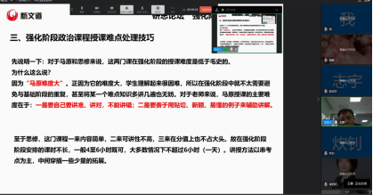 “研”与“思”是两个概念,“思”更多的是个人思考的结果,“研”是多人思考成果和智慧碰撞的结晶,教学环节是教研思想的升华,新文道集团优秀的教师不吝把自己教学思考的成果融入到整个集团的教学研讨活动中,把教学过程中积累的经验进行分享,进而得到提升,使全集团的教师受益。