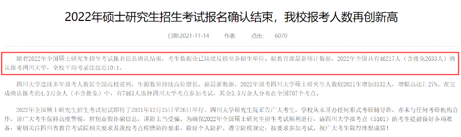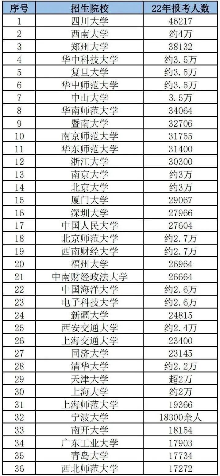 四川大学是当之无愧的报考人数排名第一,已连续几年报考人数都在全国的高校前列,2022年全国共有46217人(含推免2633人)报考四川大学,全校平均考录比接近10:1,报考人数较2021年增加3132人,增幅高达7.27%,也是卷的离谱。
