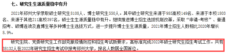 河南省历年报考总人数稳居全国前三,郑州大学作为河南省的211大学,也不例外。郑州大学在2021年度研究生教育十大新闻中公布了报考人数,2022年研考共有38312人报考郑州大学,竞争也是比较激烈的。